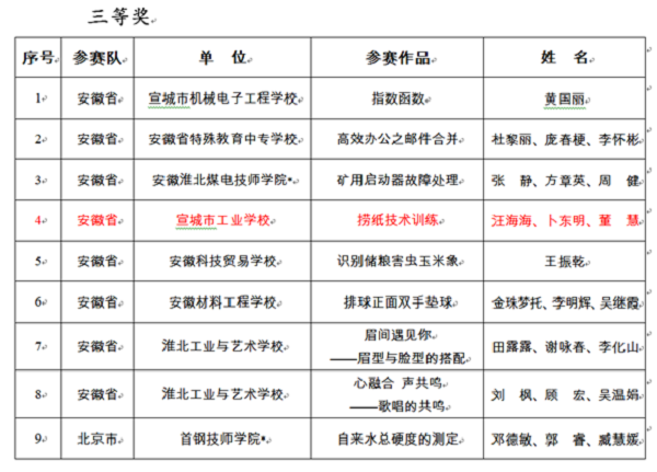 根据教职成厅函〔2019〕2号文件精神,2018年全国职业院校技能大赛职业院校教学能力比赛现场决赛于2018年11月24日—26日在济南举办。比赛共收到来自地方36个参赛队和军事职业组的1305件参赛作品。经教育部有关司局和中央军委训练管理部院校局组织的网络评审和现场决赛,中职组、高职组共产生一等奖122名,二等奖240名,三等奖346名;军事职业组共产生一等奖7名,二等奖22名,三等奖31名。我校汪海海、卜东明、董 慧老师团队参赛作品,教学设计赛项《捞纸技术训练》荣获三等奖。成绩取得,来之不易,可喜可贺,特此报喜!