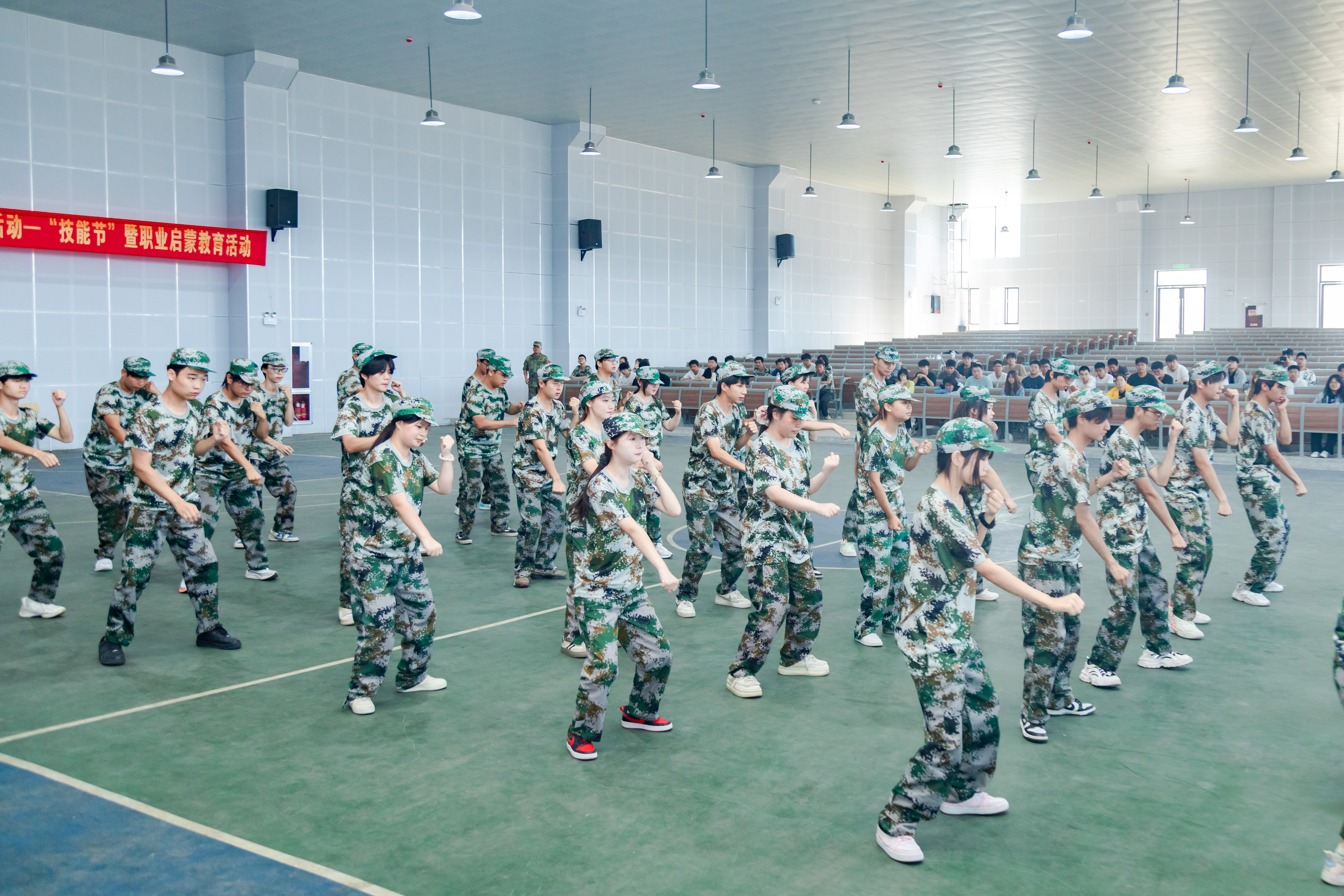 在开始军体拳汇报表演中,高职学子们一拳一脚,一招一式,一身正气立天地,一颗红心报祖国,每一次出击不仅展现了个人风采同时也提升了自己的精气神。